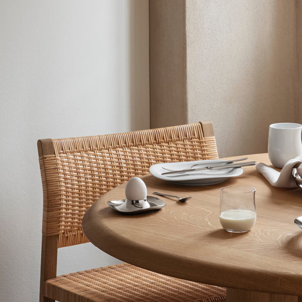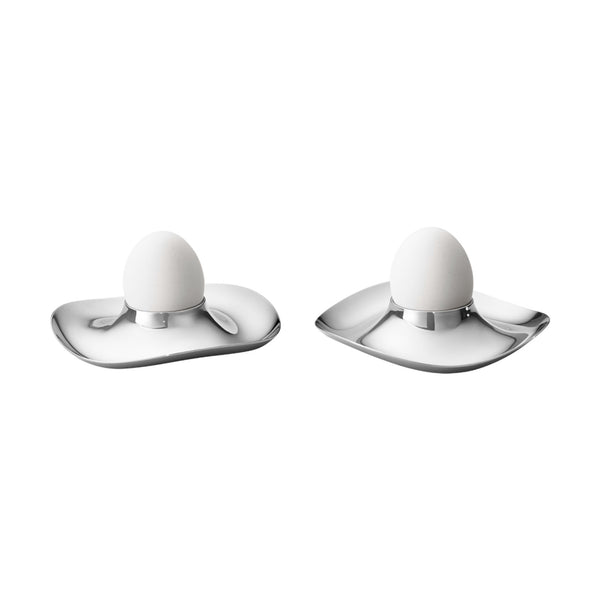 A fluid organic disc seems to float above the table, rising up in the centre to form an unusual and contemporary egg cup. Created from stainless steel, the egg cups are as practical as they are beautiful: the raised edge of the rim makes them easy to carry and the wide saucer shape can be used to hold the broken eggshells whilst you eat the contents.