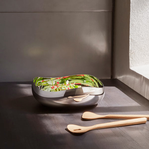 With its softly curved, almost fluid shape, this medium sized stainless steel bowl has a sense of movement that catches the eye, making it a conversation piece at a dinner party. The perfect size for serving up salads, rice or vegetables, it brings a sense of contemporary style to mealtimes, especially when grouped with other bowls from the same collection.