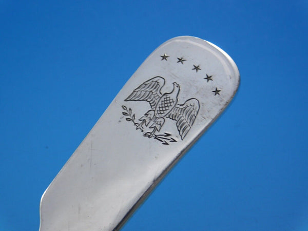 The Colonial Eagle pattern was introduced by Gorham in the year 1959. The Colonial style handle features an incised classic patriotic American symbol, the American Bald Eagle clutching an olive branch in one claw and arrows in the other, with stars overhead.