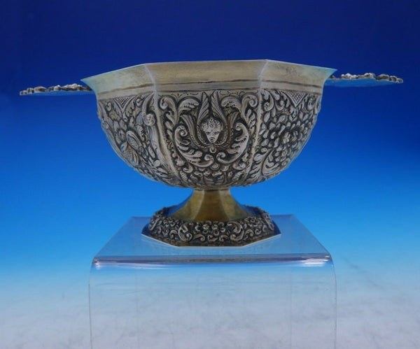 Gorgeous Colonial India vermeil silver pedestal bowl with applied cast handles. This piece features repoussed faces, fruits, and flowers (maker unknown). The bowl measures 3&quot tall x 7 3/4&quot wide (with handles) and weighs 4.8 troy ounces. It is not monogrammed and is in excellent condition. Stunning piece!