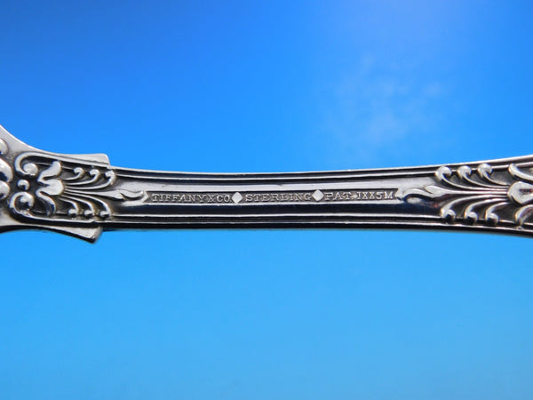 Designed by Charles Grosjean (1841-1888). Grosjean worked in his family's firm which produced high end silverware to prominent New York City retailers, including Tiffany. Upon his father's death, Grosjean left his family firm to become superintendent of Tiffany's silver factory in 1868. He had great background in silver and was an artist and was referred to as "one of the best living decorators of silver". He was a teacher in the Tiffany School and designed a few full lines of sterling patterns for Tiffany in his short time with the company before his unfortunate and sudden death. His patterns Chrysanthemum (formally Indian Chrysanthemum) and English King are some of the most famous of his designs, and of Tiffany in general.