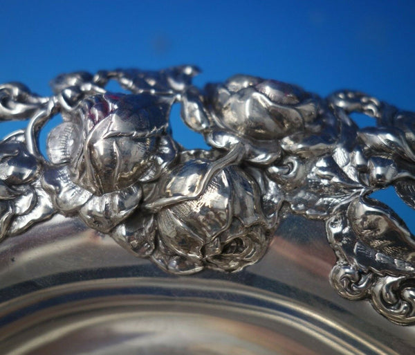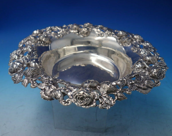 Pretty Flora by Shiebler sterling silver fruit bowl with pierced rose and leaf design marked #922, circa 1890. This bowl measures 2" tall x 10" and weighs 11.8 troy ounces. It is not monogrammed and is in good vintage condition. Lovely!