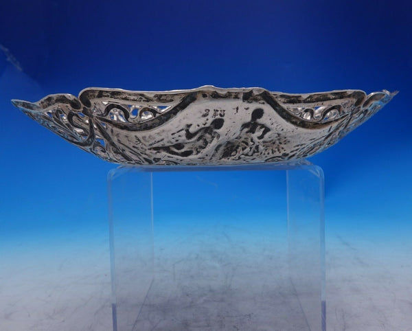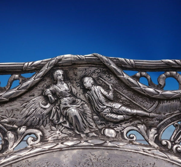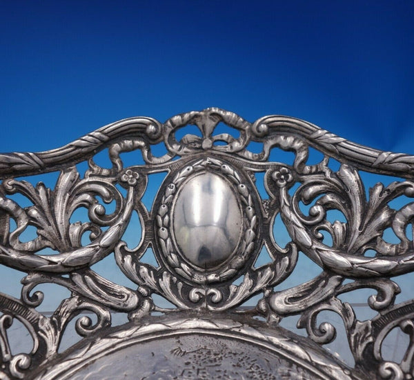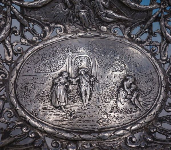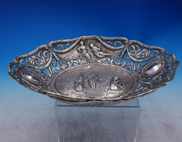 Exceptional German .800 silver bowl with courting couples (Hanau Pseudo hallmarks). This piece features a cast pierced border with swags and bows and chased figural panel with couples outside in the garden.