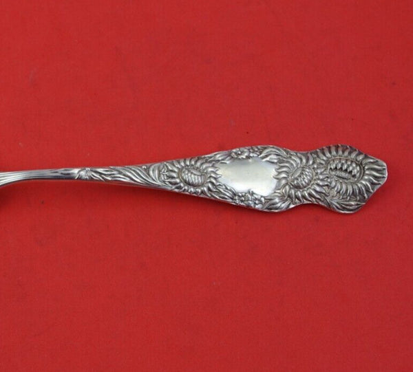 Sterling silver Cold Meat Fork 8 3/4" with sunflower and chrysanthemum motif in the pattern Chrysanthemum by Hamilton and Diesinger. It is not monogrammed and is in excellent condition.