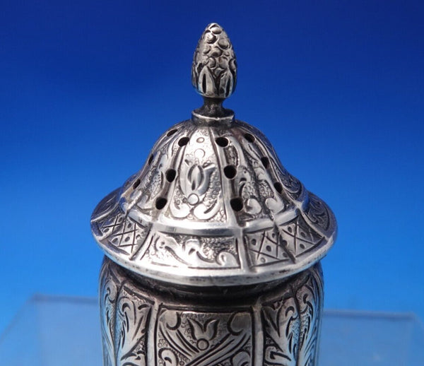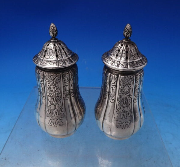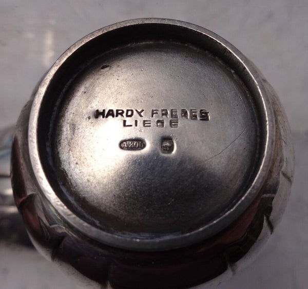 Exceptional Hardy Freres .800 silver salt and pepper shaker two-piece set made in Liege, Belgium. The shakers measure 3 1/2" tall x 1 1/2" and together weigh 3.5 troy ounces. They are not monogrammed and are in good estate condition. Absolutely beautiful!