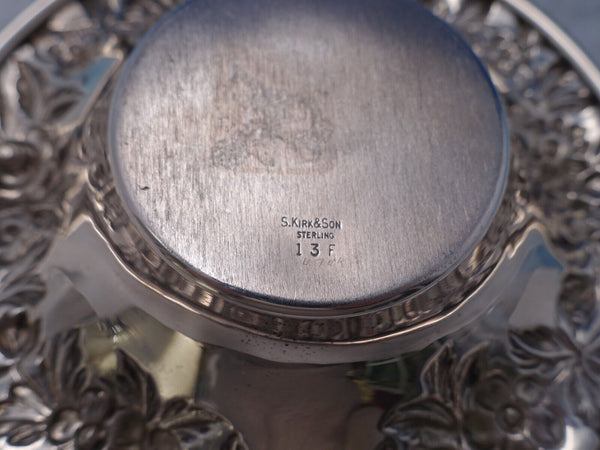 Lovely Repousse by Kirk sterling silver candy dish marked #13F. This dish measures 3/4" tall x 6" and weighs 3.8 troy ounces. It is not monogrammed and is in good estate condition as shown in the photos. Beautiful!
